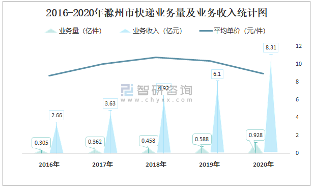 2016-2020年滁州市快遞業務量及業務收入統計圖