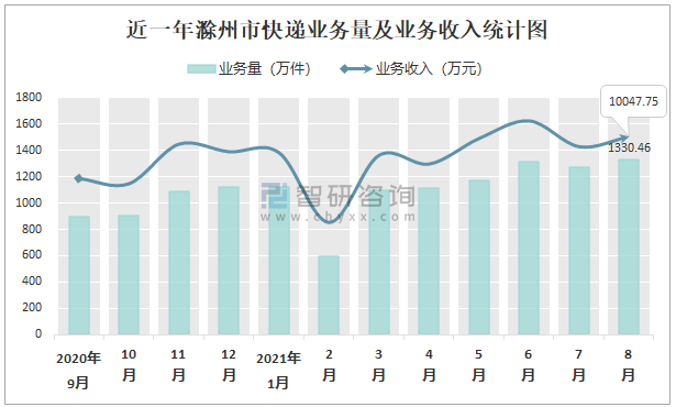 根據各省市郵政局數據可知:2021年8月滁州市快遞業務量為1330.46萬件,業務收入為10047.75萬元;2021年1-8月滁州市快遞累計業務量為9008.42萬件,同比增長71.42%,累計業務收入為73032.72萬元,同比增長50.24%;2016-2020年滁州市快遞業務量與業務收入均逐年遞增,平均單價存在一定的幅度的波動。