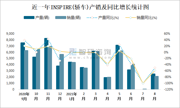 近一年INSPIRE(轎車)產銷及同比增長統計圖
