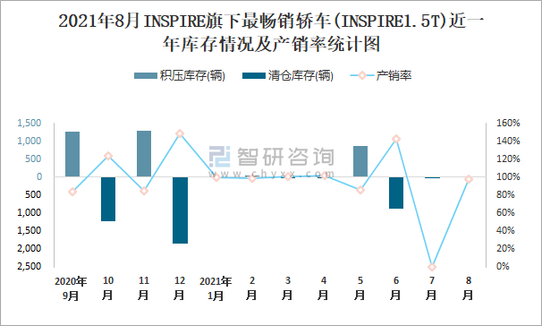 2021年8月INSPIRE旗下最暢銷車(INSPIRE1.5T)近一年庫存情況及產銷率統計圖