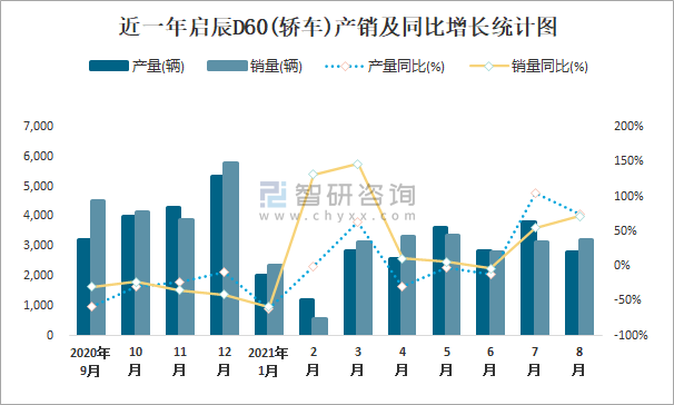 近一年啟辰D60(轎車)產銷及同比增長統計圖
