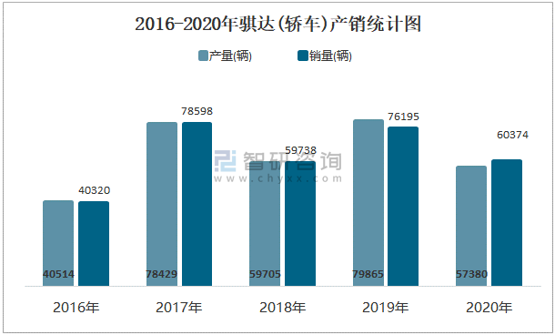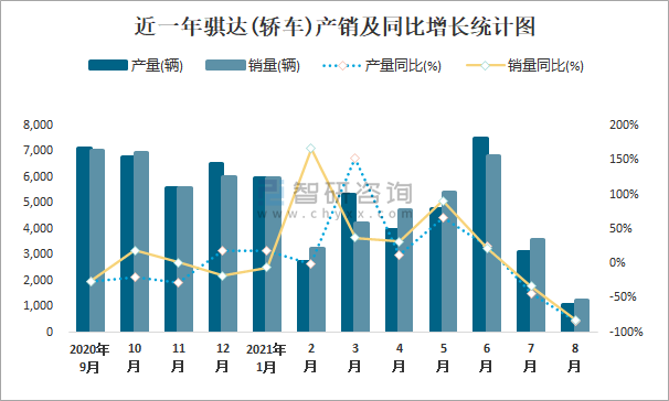 根據中國汽車工業協會數據可知:2021年8月騏達(轎車)產量為1072輛,同比下降82.9%,銷量為1264輛,同比下降81.4%,當月產銷率為117.91%;2021年1-8月騏達(轎車)累計產量為34455輛,同比增長9.9%,累計銷量為35243輛,同比增長1.3%,累計產銷率為102.29%;2016-2020年騏達(轎車)產銷量2019年起呈現下降趨勢,且近5年總產量大于總銷量,積壓了庫存668輛。