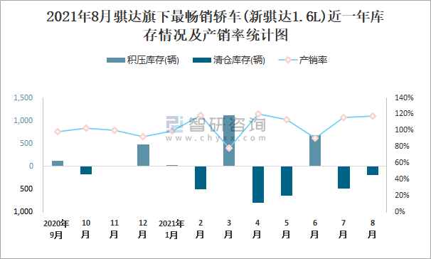 2021年8月騏達旗下最暢銷車(新騏達1.6L)近一年庫存情況及產銷率統計圖