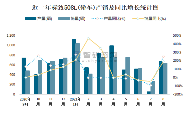 近一年標致508L(轎車)產銷及同比增長統計圖