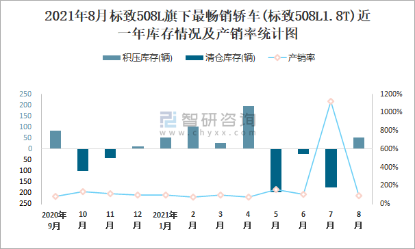 2021年8月標致508L旗下最暢銷車(標致508L1.8T)近一年庫存情況及產銷率統計圖