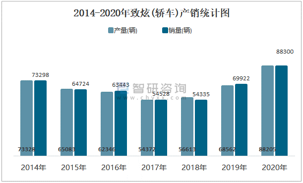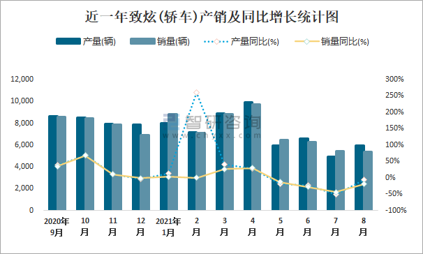 根據中國汽車工業協會數據可知:2021年8月致炫(轎車)產量為5980輛,同比下降6.3%,銷量為5357輛,同比下降18.8%,當月產銷率為89.58%;2021年1-8月致炫(轎車)累計產量為57393輛,同比增長3.9%,累計銷量為58066輛,同比增長2.9%,累計產銷率為101.17%;2014-2020年致炫(轎車)產銷量2018年跌至最低值,此后逐年遞增,且近7年總銷量大于總產量,清倉庫存41輛。