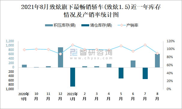 2021年8月致炫旗下最暢銷車(致炫1.5)近一年庫存情況及產銷率統計圖