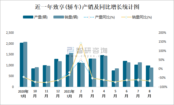 根據(jù)中國汽車工業(yè)協(xié)會數(shù)據(jù)可知:2021年8月致享(轎車)產(chǎn)量為981輛,同比下降62.3%,銷量為878輛,同比下降67.5%,當(dāng)月產(chǎn)銷率為89.5%;2021年1-8月致享(轎車)累計(jì)產(chǎn)量為9266輛,同比下降53.6%,累計(jì)銷量為9309輛,同比下降54.2%,累計(jì)產(chǎn)銷率為100.46%;2017-2020年致享(轎車)產(chǎn)銷量均在2019年達(dá)到最高值,此后大幅度下滑,且近4年總產(chǎn)量大于總銷量,積壓了庫存157輛。