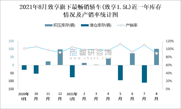 2021年8月致享旗下最暢銷車(致享1.5L)近一年庫存情況及產(chǎn)銷率統(tǒng)計(jì)圖