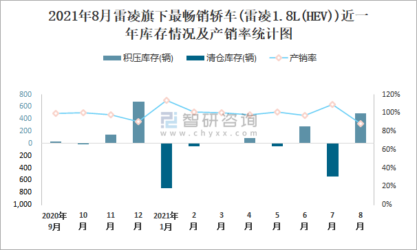 2021年8月雷凌旗下最暢銷車(雷凌1.8L(HEV))近一年庫存情況及產銷率統計圖