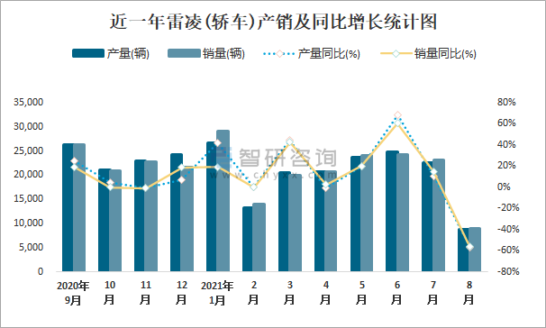 根據中國汽車工業協會數據可知:2021年8月雷凌(轎車)產量為8864輛,同比下降56.8%,銷量為9074輛,同比下降55.8%,當月產銷率為102.37%;2021年1-8月雷凌(轎車)累計產量為161315輛,同比增長23.9%,累計銷量為164471輛,同比增長21.8%,累計產銷率為101.96%;2014-2020年雷凌(轎車)產銷量逐年遞增,且近7年總產量大于總銷量,積壓了庫存4027輛。