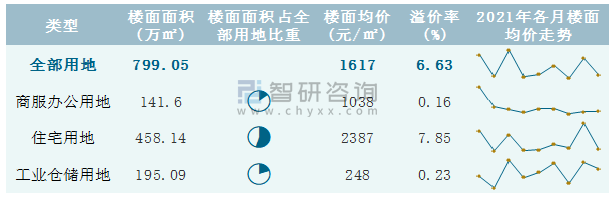 根據國信房地產信息網數據統計可知:2021年9月青海省全部用地出讓地面均價為697元/㎡,其中住宅用地出讓地面均價最高(4422元/㎡),全部用地成交地面均價為694元/㎡,其中住宅用地成交地面均價為2095元/㎡,高于商服辦公用地成交地面均價;2021年1-9月青海省住宅用地樓面面積占其全部用地比重最多,為57.34%,溢價率為7.85%。