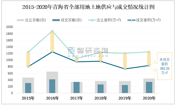 2015-2020年青海省全部用地土地供應與成交情況統計圖