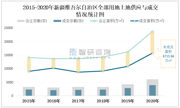 2015-2020年新疆維吾爾自治區全部用地土地供應與成交情況統計圖