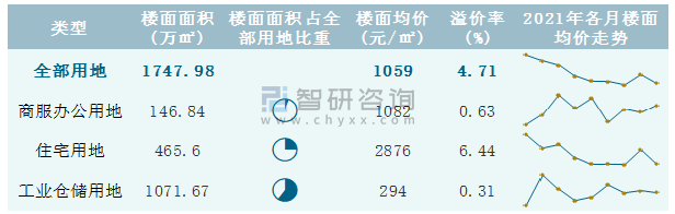 根據國信房地產信息網數據統計可知:2021年9月石家莊市全部用地出讓地面均價為2802元/㎡,其中住宅用地出讓地面均價最高(6986元/㎡),全部用地成交地面均價為1010元/㎡,其中住宅用地成交地面均價為2480元/㎡,高于商服辦公用地成交地面均價;2021年1-9月石家莊市工業倉儲用地樓面面積占其全部用地比重最多,為61.31%,溢價率為0.31%。