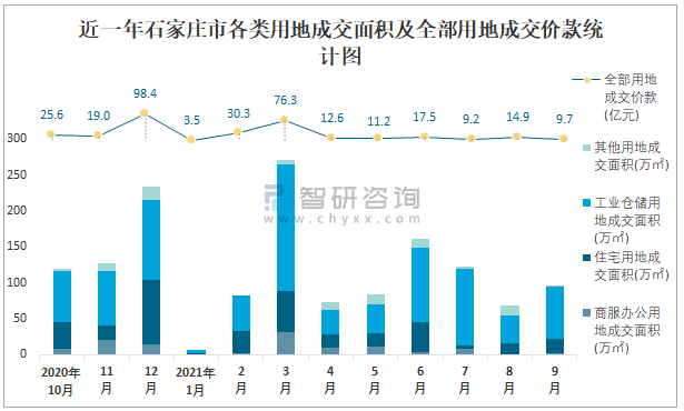 近一年石家莊市各類用地成交面積及全部用地成交價款統計圖