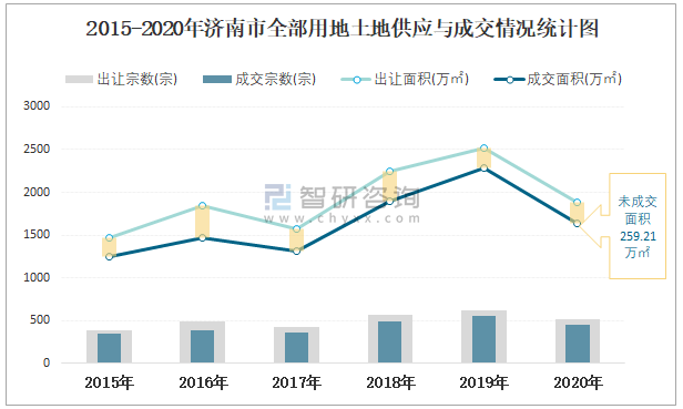 2015-2020年濟南市全部用地土地供應(yīng)與成交情況統(tǒng)計圖