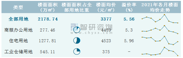 根據國信房地產信息網數據統計可知:2021年9月鄭州市全部用地出讓地面均價為1618元/㎡,其中住宅用地出讓地面均價最高(4329元/㎡),全部用地成交地面均價為1075元/㎡,其中住宅用地成交地面均價為4461元/㎡,高于商服辦公用地成交地面均價;2021年1-9月鄭州市住宅用地樓面面積占其全部用地比重最多,為58.65%,溢價率為5.96%。