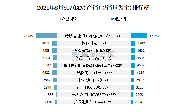 2021年8月SUV(BEV)產銷(以銷量為主)排行榜