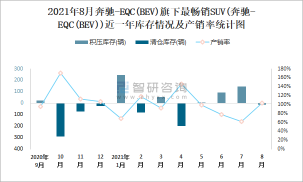 2021年8月奔馳-EQC(BEV)旗下最暢銷SUV(奔馳-EQC(BEV))近一年庫存情況及產銷率統(tǒng)計圖