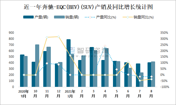 近一年奔馳-EQC(BEV) (SUV)產銷及同比增長統(tǒng)計圖
