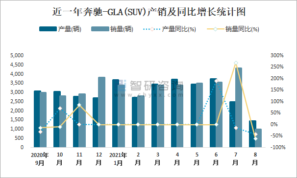 近一年奔馳-GLA(SUV)產銷及同比增長統計圖