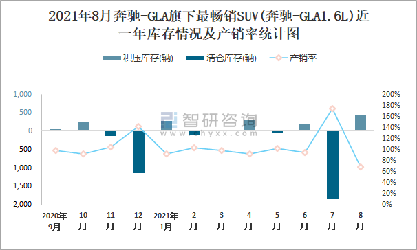2021年8月奔馳-GLA旗下最暢銷SUV(奔馳-GLA1.6L)近一年庫存情況及產銷率統計圖