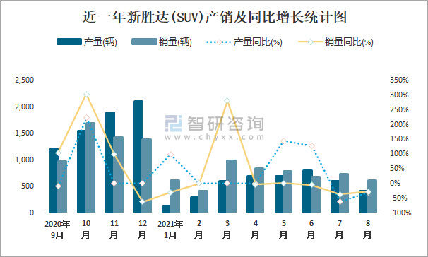 近一年新勝達(SUV)產銷及同比增長統計圖