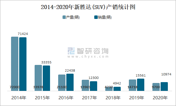 根據中國汽車工業協會數據可知:2021年8月新勝達(SUV)產量為420輛,同比下降30%,銷量為618輛,同比下降26.9%,當月產銷率為147.14%;2021年1-8月新勝達(SUV)累計產量為4240輛,同比增長44.4%,累計銷量為5695輛,同比增長3.6%,累計產銷率為134.32%;2014-2020年新勝達(SUV)產銷量均在2014年達到最高值,此后總體呈現下降趨勢,且近7年總銷量大于總產量,清倉庫存1303輛。