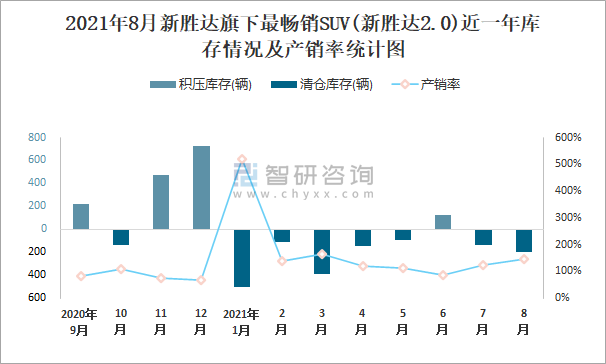 根據中國汽車工業協會數據統計可知:2021年8月新勝達(SUV)旗下只有1款新勝達2.0SUV在銷售;近一年新勝達2.0共清倉庫存168輛,其產銷率存在一定幅度波動,2021年1月產銷率最高(518.33%),清倉庫存502輛,2020年12月產銷率偏低(65.59%),積壓庫存727輛。