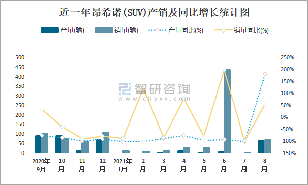 2021年8月昂希諾(SUV)產銷量分別為68輛和71輛 當月產銷率為104.41%
