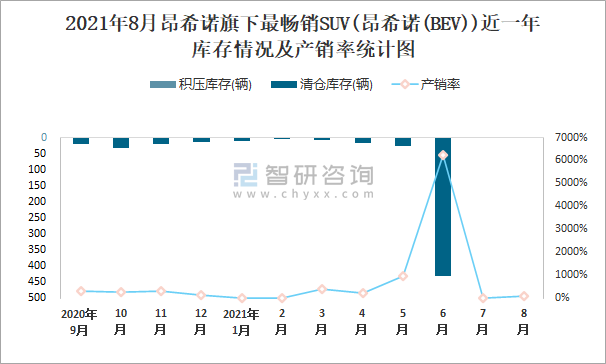 2021年8月昂希諾旗下最暢銷SUV(昂希諾(BEV))近一年庫存情況及產銷率統計圖