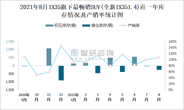 2021年8月IX35旗下最暢銷SUV(全新IX351.4)近一年庫存情況及產銷率統計圖