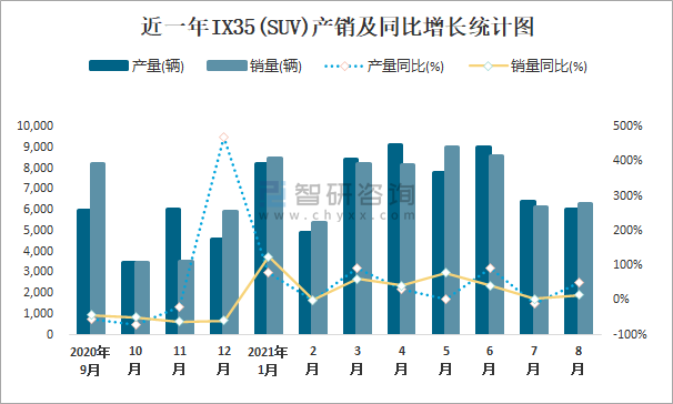 近一年IX35(SUV)產銷及同比增長統計圖