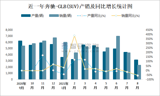 近一年奔馳-GLB(SUV)產銷及同比增長統計圖
