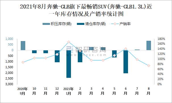 2021年8月奔馳-GLB旗下最暢銷SUV(奔馳-GLB1.3L)近一年庫存情況及產銷率統計圖