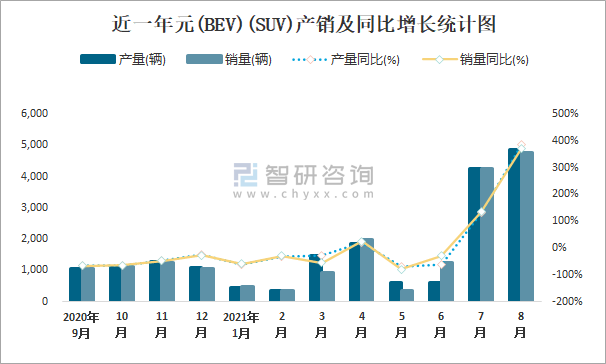 近一年元(BEV) (SUV)產(chǎn)銷及同比增長統(tǒng)計圖