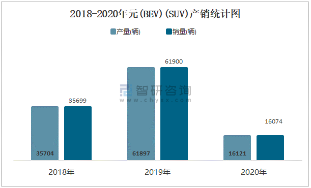 2018-2020年元(BEV) (SUV)產(chǎn)銷統(tǒng)計圖
