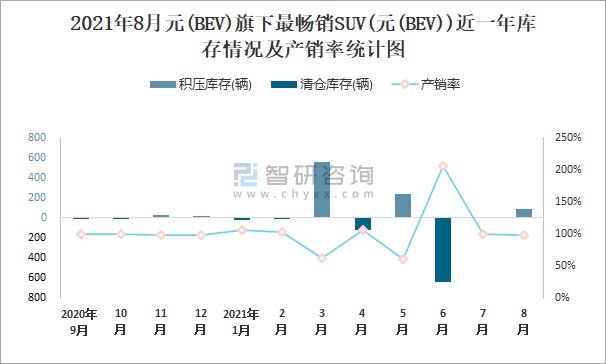 2021年8月元(BEV)旗下最暢銷SUV(元(BEV))近一年庫存情況及產(chǎn)銷率統(tǒng)計圖