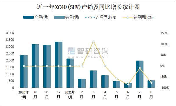 根據中國汽車工業協會數據可知:2021年8月XC40(SUV)產量為519輛,同比下降77%,銷量為519輛,同比下降77%,當月產銷率為100%;2021年1-8月XC40(SUV)累計產量為8182輛,同比下降24.5%,累計銷量為8182輛,同比下降24.5%,累計產銷率為100%;且2020年XC40(SUV)總銷量等于總產量,無積壓庫存,庫存管理良好。