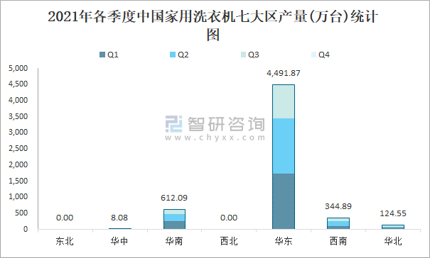 2021年各季度中國家用洗衣機七大區產量統計圖