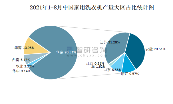 2021年1-8月中國家用洗衣機產量大區占比統計圖