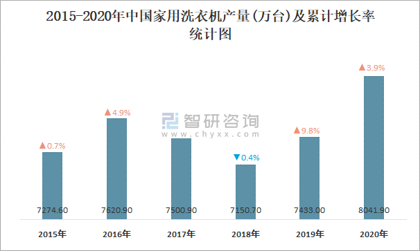 2015-2020年中國家用洗衣機產量及累計增長率統計圖