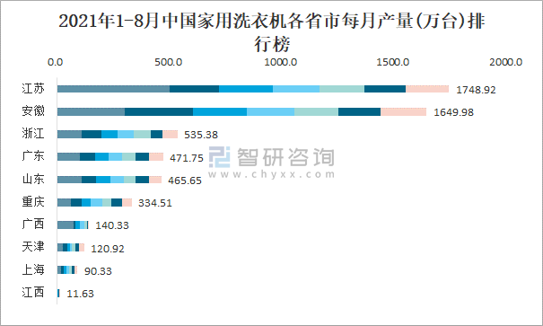 2021年1-8月中國家用洗衣機各省市每月產量排行榜