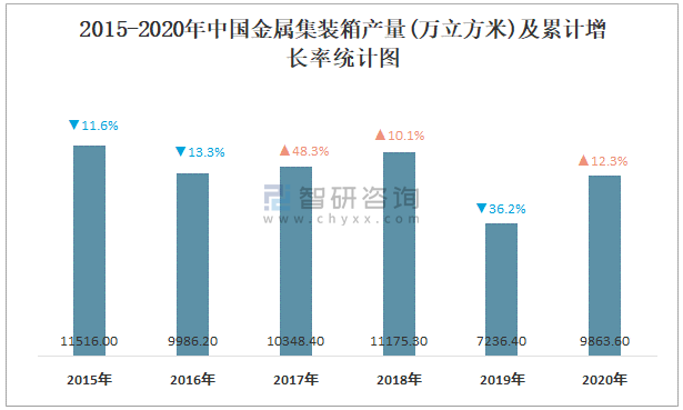 2015-2020年中國金屬集裝箱產(chǎn)量及累計增長率統(tǒng)計圖
