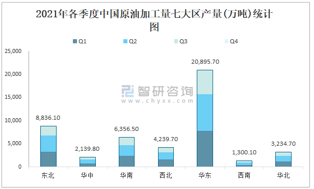 2021年各季度中國原油加工量七大區(qū)產(chǎn)量統(tǒng)計(jì)圖