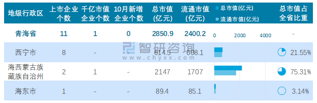 據同花順統計數據可知:截止至2021年10月31日,青海省的A股上市企業共計11家,上市企業數量排名全國第31,總市值共計2850.9億元;僅西寧市、海西蒙古族藏族自治州、海東市3個地級行政區有企業在A股上市,西寧市上市企業數量最多,為8家;其中僅海西蒙古族藏族自治州1個地級行政區有1家千億市值企業;海西蒙古族藏族自治州A股上市企業總市值和總流通市值均為最高。