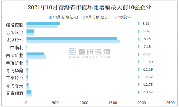 據同花順統計數據可知:相較于2021年9月,青海省10月有2家企業總市值呈現不同程度的增長,其增幅均低于50%,其中從事化學制品行業的藏格控股增幅和增量均為最大,環比增長8.11%,總市值增加43.27億元;9家企業總市值環比出現下滑。