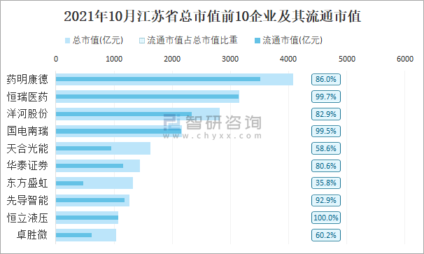 2021年10月江蘇省總市值前10企業及其流通市值