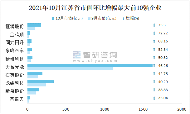 2021年10月江蘇省市值環比增幅最大前10強企業